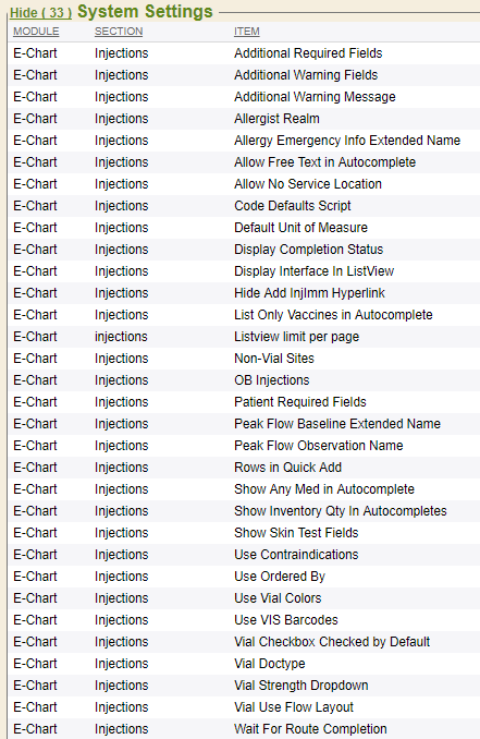 There are several system settings that drive the fields and available choices found in the Injection/Immunization module. With the appropriate security permissions, users can navigate to the System Settings tab, found in the Control Panel, and edit/update with the appropriate information or values. The available system settings are multitudinous, but they are intended to control functions ranging from autocompletes and dropdowns to defaults and alerts. Be sure to use caution whenever editing system settings.