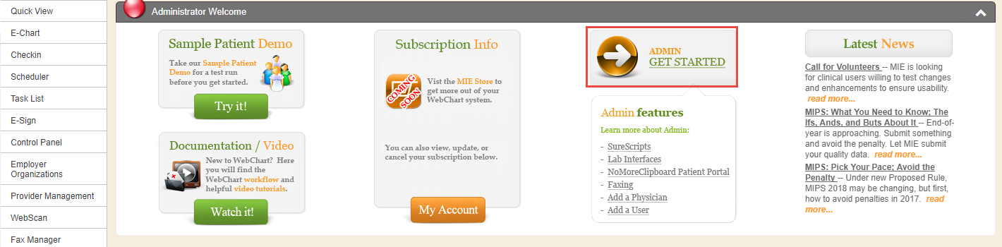 To begin addressing the requirements for effective use of the Enterprise Health system, navigate to the Administrator Welcome section of the Quick View, and click the Admin Get Started link. Here, users are presented with various areas of the system that require initial setup and consideration for configuration.