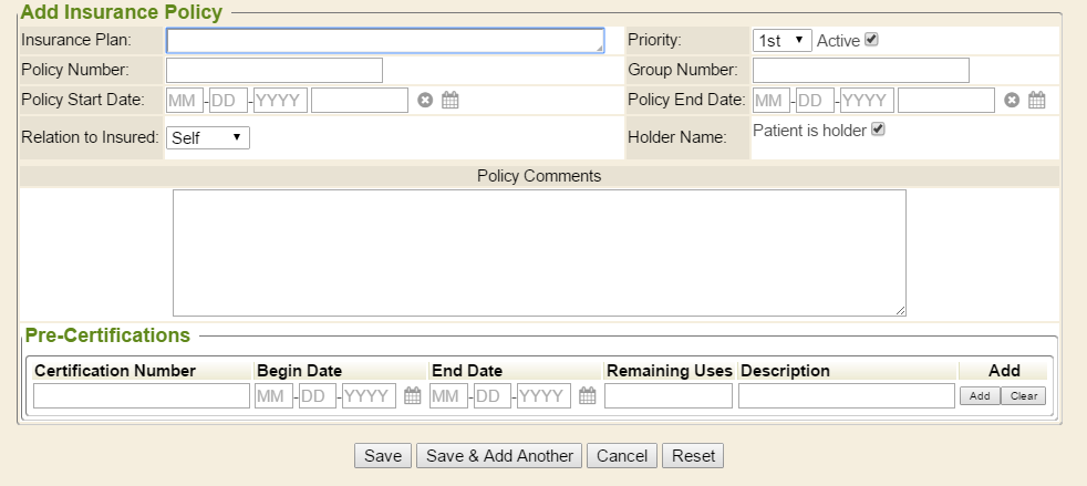 When adding an insurance policy to a chart, the ability to enter precertification details is available, as well. For example, a patient needing physical therapy may be precertified for 10 visits, spanning October through December. This can be documented in the chart when adding or editing the insurance in the Demographics chart tab.